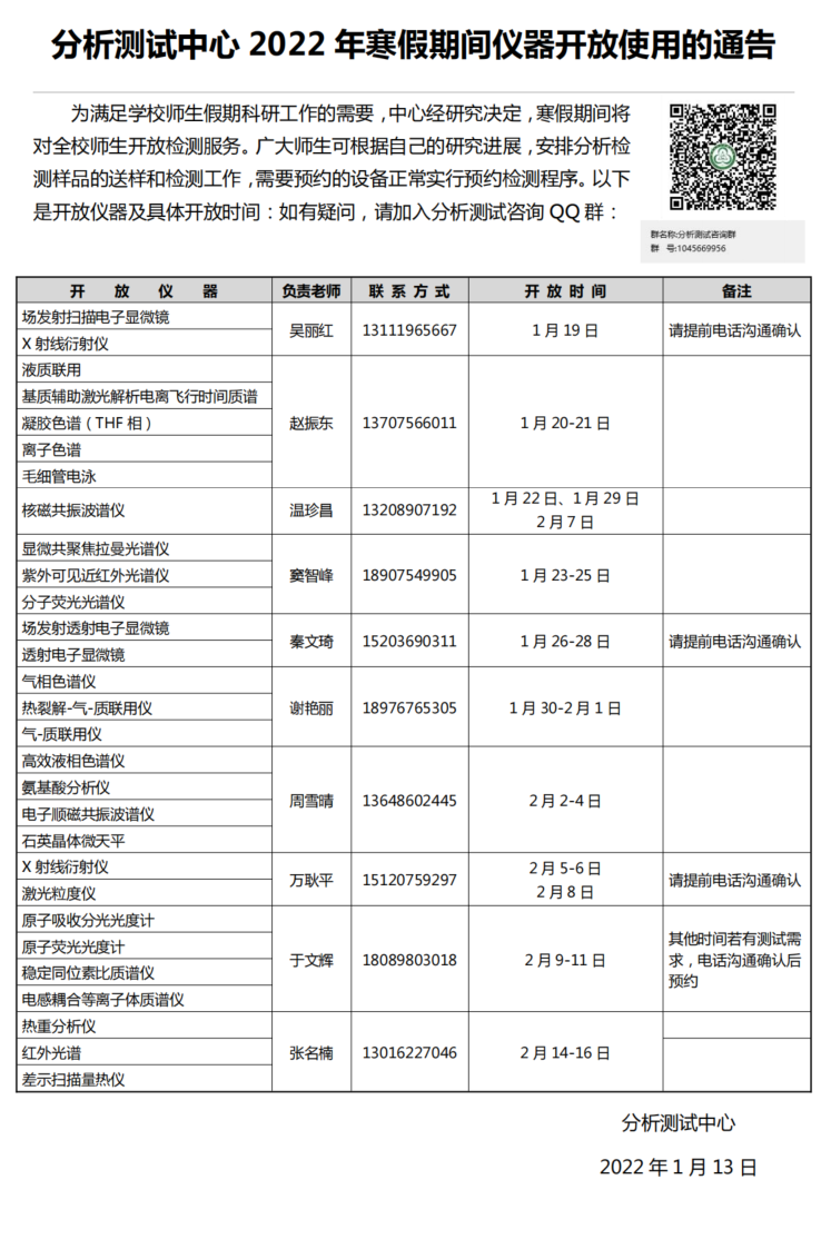 分析测试中心2022年寒假期间仪器开放使用的通告