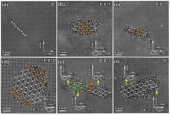 图3 经T8-80%处理的峰值时效和过时效富硅合金中B'相关析出相的原子分辨率HAADF-STEM图像