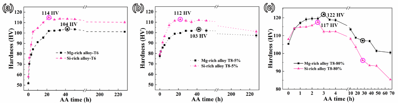 图1展示了常规热处理(T6)、小变形+人工时效处理(T8-5%)和大变形+人工时效处理(T8-80%)合金的时效硬化曲线。在T6和T8-5%状态下,富Si合金的峰值硬度始终高于富Mg合金。而经过T8-80%处理后,富Mg合金的峰值硬度反而高于富Si合金。将这种现象称为硬度反转。