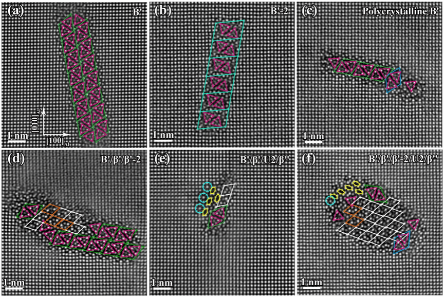 过去的研究表明,对于T6和T8-5%处理的合金,主要强化相类型为β"相,因此富硅合金的峰值时效硬度高于富镁合金。原子分辨率HAADF-STEM成像表明,T8-80%合金中的主要析出相类型是富镁的后期析出相,即β'(图2)和B'析出相及其复合析出相(图3),而不是β"相。β'相的单胞与铝基体之间存在多种取向关系。