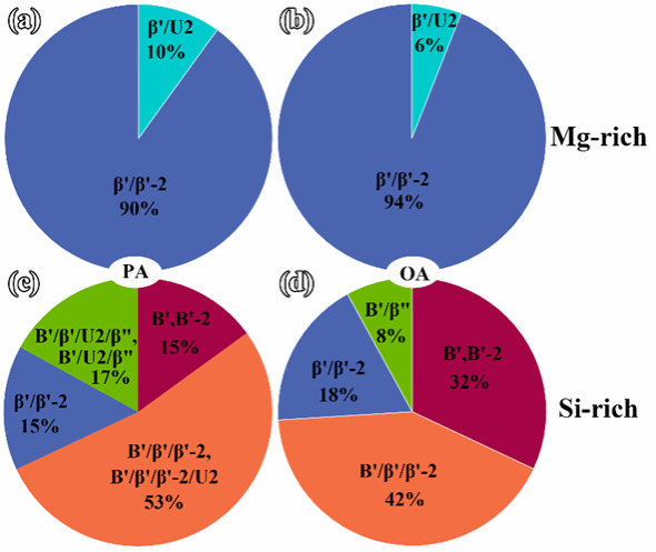 图4展示了T8-80%工艺处理后Al-Mg-Si合金中峰值时效和过时效阶段各类析出相的占比。β'(/β'-2)相是富Mg合金中主要析出相,其占比超过90%。而富Si合金中析出相的主要类型为B'相,β'(/β'-2)相以及它们的复合相,其中B'相及其复合相占比超过80%。